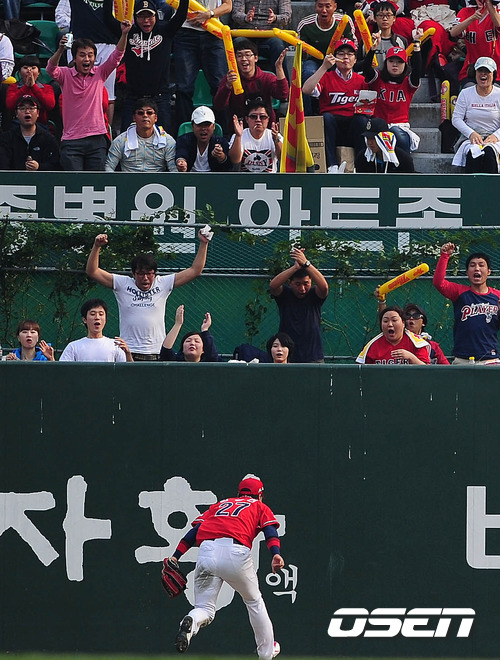 '2011 롯데카드 프로야구' SK 와이번스와 KIA 타이거즈의 준플레이오프 2차전이 9일 문학야구장에서 열렸다. 3회말 선두타자 박재상의 좌익수 키를 넘기는 안타성 타구를 KIA 김상현 좌익수가 멋지게 포구 아웃 처리 시키며 관중들의 환영을 받고 있다. 준플레이오프 2차전에서는 SK 송은범(27)과 KIA 로페즈(36)가 첫 선발 맞대결을 펼친다. 3선승제의 준플레이오프 1차전을 내줘 쫓기는 입장이 된 SK로서는 2차전을 반드시 승리로 이끌어야 한다. 그런 만큼 송은범의 피칭에 기대를 걸어야 한다. 그에 반해 로페즈는 1차전에서 윤석민의 완투승으로 인해 상대적인 부담을 덜 수 있게 됐다. KIA는 지난해까지 4년 중 3번의 가을 잔치서 '리버스 스윕'으로 두 번의 한국시리즈 패권을 거머쥐었고 한국시리즈행 티켓도 쥔 바 있는 SK이기에 1승을 잊고 경기에 임하겠다는 각오. 한편 SK는 시즌 종반 김성근 전 감독의 사퇴로 내홍을 앓았고, KIA는 시즌 중반 1위에서 4위로 떨어지는 심각한 성적 하락을 겪었다. 프로야구 준플레이오프 5전 3선승제로 진행된다. 8~9일 인천 문학구장에서 2연전이 열리고 하루를 쉰 뒤 11~12일 광주구장에서 3, 4차전이 이어진다. 4차전까지 승부를 가리지 못하면 14일 문학구장으로 돌아와 최종전을 벌인다. / ajyong@osen.co.kr