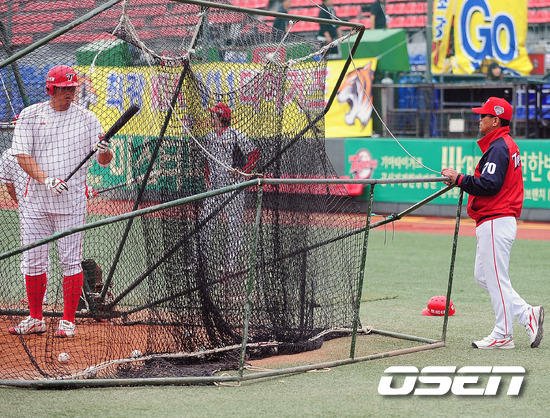 '2011 롯데카드 프로야구' KIA 타이거즈와 SK 와이번스의 준플레이오프 4차전이 12일 오후 광주 무등 야구장에서 열릴 예정인 가운데 양팀이 훈련시간을 가졌다. KIA 조범현 감독이 타격연습을 하던 최희섭에게 말을 걸고 있다. 준플레이오프 4차전에서는 KIA 타이거즈의 에이스 윤석민과 SK 와이번스의 윤희상이 맞대결을 펼친다. 3선승제의 준플레이오프에서 1승 2패로 벼랑끝에 몰린 KIA는 남은 두경기를 모두 이겨야만 플레이오프에 진출할 수 있는 상황이다. 이에 KIA는 1차전에서 완투승을 거둔 윤석민이 3일 휴식 후 바로 선발 등판시켰다. 시리즈 전적 1승2패로 몰린 KIA의 경우 윤석민의 등판 시점을 하루 앞당겼다. 조 감독의 얼쩔 수 없는 무리수다. 한편 SK는 이만수 감독대행은 5차전에서 에이스 김광현을 등판시키기로 했다. 2승1패로 앞선 만큼 4차전을 내주더라도 5차전에서 에이스 김광현을 투입해 승리할 수 있다는 자신감을 보여줬다. 지난 1~3차전에서 보여주듯 철저한 투수전 양상으로 흐르는 준플레이오프에서 SK는 강점인 불펜의 힘을 극대화 하고, KIA는 불펜의 약점을 얼마나 상쇄할 수 있느냐가 관건이다. 또 양 팀 모두 극도의 빈타에서 탈출해야 한다. 앞서 SK는 시즌 종반 김성근 전 감독의 사퇴로 내홍을 앓았고 KIA는 시즌 중반 1위에서 4위로 떨어지는 심각한 성적 하락을 겪은 바 있다. 한편 프로야구 준플레이오프는 5전 3선승제로 진행된다. 8~9일 인천 문학구장에서 2연전이 진행됐고, 11~12일 광주구장에서 3, 4차전이 이어진다. 4차전까지 승부를 가리지 못하면 14일 문학구장으로 돌아와 최종전을 벌인다. / rumi@osen.co.kr