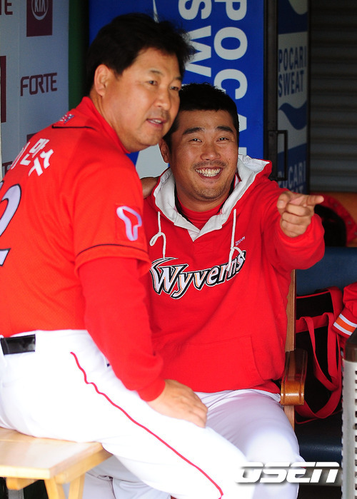 '2011 롯데카드 프로야구' KIA 타이거즈와 SK 와이번스의 준플레이오프 4차전이 12일 오후 광주 무등 야구장에서 열릴 예정인 가운데 양팀이 훈련시간을 가졌다. SK 이만수 감독이 이호준을 자신의 감독석에 앉힌 후 얘기를 하고 있다. 준플레이오프 4차전에서는 KIA 타이거즈의 에이스 윤석민과 SK 와이번스의 윤희상이 맞대결을 펼친다. 3선승제의 준플레이오프에서 1승 2패로 벼랑끝에 몰린 KIA는 남은 두경기를 모두 이겨야만 플레이오프에 진출할 수 있는 상황이다. 이에 KIA는 1차전에서 완투승을 거둔 윤석민이 3일 휴식 후 바로 선발 등판시켰다. 시리즈 전적 1승2패로 몰린 KIA의 경우 윤석민의 등판 시점을 하루 앞당겼다. 조 감독의 얼쩔 수 없는 무리수다. 한편 SK는 이만수 감독대행은 5차전에서 에이스 김광현을 등판시키기로 했다. 2승1패로 앞선 만큼 4차전을 내주더라도 5차전에서 에이스 김광현을 투입해 승리할 수 있다는 자신감을 보여줬다. 지난 1~3차전에서 보여주듯 철저한 투수전 양상으로 흐르는 준플레이오프에서 SK는 강점인 불펜의 힘을 극대화 하고, KIA는 불펜의 약점을 얼마나 상쇄할 수 있느냐가 관건이다. 또 양 팀 모두 극도의 빈타에서 탈출해야 한다. 앞서 SK는 시즌 종반 김성근 전 감독의 사퇴로 내홍을 앓았고 KIA는 시즌 중반 1위에서 4위로 떨어지는 심각한 성적 하락을 겪은 바 있다. 한편 프로야구 준플레이오프는 5전 3선승제로 진행된다. 8~9일 인천 문학구장에서 2연전이 진행됐고, 11~12일 광주구장에서 3, 4차전이 이어진다. 4차전까지 승부를 가리지 못하면 14일 문학구장으로 돌아와 최종전을 벌인다. / rumi@osen.co.kr
