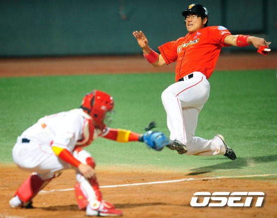 '2011 롯데카드 프로야구' KIA 타이거즈와 SK 와이번스의 준플레이오프 4차전이 12일 오후 광주 무등 야구장에서 열렸다. 3회초 2사 주자 2루 SK 최동수의 좌익수 앞 1루타때 2루 주자 박정권이 홈으로 몸을 날리고 있다. 준플레이오프 4차전에서는 KIA 타이거즈의 에이스 윤석민과 SK 와이번스의 윤희상이 맞대결을 펼쳤다. 3선승제의 준플레이오프에서 1승 2패로 벼랑끝에 몰린 KIA는 남은 두경기를 모두 이겨야만 플레이오프에 진출할 수 있는 상황이다. 이에 KIA는 1차전에서 완투승을 거둔 윤석민이 3일 휴식 후 바로 선발 등판시켰다. 시리즈 전적 1승2패로 몰린 KIA의 경우 윤석민의 등판 시점을 하루 앞당겼다. 조 감독의 얼쩔 수 없는 무리수다. 한편 SK는 이만수 감독대행은 5차전에서 에이스 김광현을 등판시키기로 했다. 2승1패로 앞선 만큼 4차전을 내주더라도 5차전에서 에이스 김광현을 투입해 승리할 수 있다는 자신감을 보여줬다. 지난 1~3차전에서 보여주듯 철저한 투수전 양상으로 흐르는 준플레이오프에서 SK는 강점인 불펜의 힘을 극대화 하고, KIA는 불펜의 약점을 얼마나 상쇄할 수 있느냐가 관건이다. 또 양 팀 모두 극도의 빈타에서 탈출해야 한다. 앞서 SK는 시즌 종반 김성근 전 감독의 사퇴로 내홍을 앓았고 KIA는 시즌 중반 1위에서 4위로 떨어지는 심각한 성적 하락을 겪은 바 있다. 한편 프로야구 준플레이오프는 5전 3선승제로 진행된다. 8~9일 인천 문학구장에서 2연전이 진행됐고, 11~12일 광주구장에서 3, 4차전이 이어진다. 4차전까지 승부를 가리지 못하면 14일 문학구장으로 돌아와 최종전을 벌인다. / rumi@osen.co.kr
