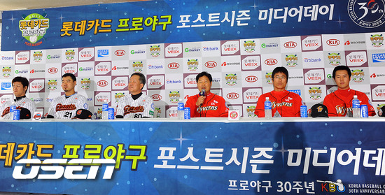 15일 오후 부산 사직구장 내 특설무대에서 열린 '2011 롯데카드 프로야구 포스트시즌 플레이오프 미디어데이'에서 SK 이만수 감독대행이 소감을 말하고 있다. 이날 미디어데이에서 롯데는 양승호 감독과 송승준, 강민호가 SK는 이만수 감독대행과 박정권, 최정이 참석했다. 한편 2011 롯데카드 프로야구 플레이오프 1차전은 16일 오후 2시 부산 사직야구장서 열린다./ soul1014@osen.co.kr
