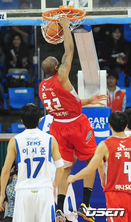 [OSEN=잠실학생체 ,백승철 인턴기자] 15일 오후 서울 잠실 학생체육관서 열린 '2011-2012 KB국민카드 프로농구' 정규리그 서울 SK와 서울 삼성의 경기 4쿼터 SK 존슨이 덩크슛을 하고 있다. 김상준 감독이 이끄는 서울 삼성은 서울 SK와 경기서 이승준(23득점, 12리바운드, 6도움)의 확약에 힘입어 85-81로 승리했다. 이날 승리로 삼성은 올 시즌 첫승을 챙겼고 김상준 김독도 KBL 데뷔 무대서 승리를 거두는 기뿜을 누렸다. 반면 SK는 개막전 KCC와경기에 이어 2연패에 빠지고 말았다. 한편, 지난 13일 '2011-2012 KB국민카드 프로농구' 정규리그가 막을 올리면서 6개월여간의 대장정에 돌입한 프로농구는 이번 시즌부터 외국인 선수를 자유 계약으로 선발하게 하고 팀당 1명만 보유할 수 있도록 한 제도 변화가 정규리그에서 어떤 변수로 나타날지 팬들의 기대를 받고 있다. / baik@osen.co.kr