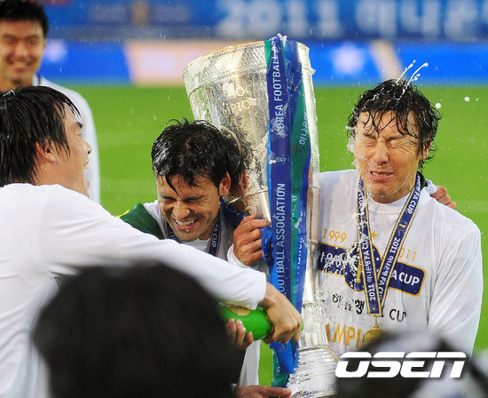 15일 오후 성남탄천종합운동장서 열린 '2011 하나은행 FA컵' 성남 일화와 수원 삼성의 결승전에서 후반 32분 터진 조동건의 헤딩골에 힘입어 1-0으로 승리했다. 성남 에벨징요와 신태용 감독이 트로피를 들고 기뻐할때 샴페인 세례를 받고 있다. 1999년 천안 일화 시절 FA컵 우승을 달성한 성남은 12년 만에 두 번째 우승을 거뒀다. 또한 2009년 결승서 수원에 승부차기 끝에 패한 것을 설욕했다. 조동건은 경기 후 MVP에 선정돼 300만원의 상금과 트로피를 받았다. 올 시즌 중반 라돈치치가 팀에 복귀하면서 출전 시간이 줄어든 조동건은 가장 극적인 골을 성공시키며 성남의 중심 선수로 우뚝 섰다. 한편, 지도자상은 신태용 감독과 김도훈 코치에게 돌아갔고 FA컵 득점왕은 고슬기(울산 현대, 4골)가 차지했다. / rumi@osen.co.kr