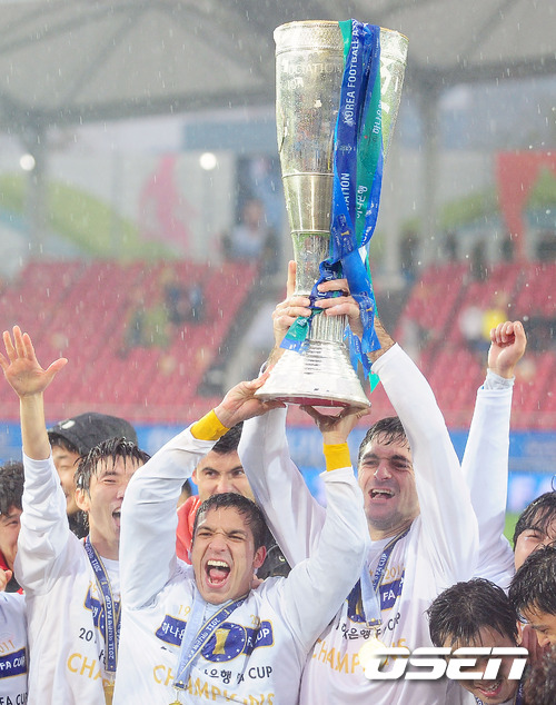 15일 오후 성남탄천종합운동장서 열린 '2011 하나은행 FA컵' 성남 일화와 수원 삼성의 결승전에서 후반 32분 터진 조동건의 헤딩골에 힘입어 1-0으로 승리했다. 성남 사샤가 동료들과 함께 우승트로피를 높이들고 있다. 1999년 천안 일화 시절 FA컵 우승을 달성한 성남은 12년 만에 두 번째 우승을 거뒀다. 또한 2009년 결승서 수원에 승부차기 끝에 패한 것을 설욕했다. 조동건은 경기 후 MVP에 선정돼 300만원의 상금과 트로피를 받았다. 올 시즌 중반 라돈치치가 팀에 복귀하면서 출전 시간이 줄어든 조동건은 가장 극적인 골을 성공시키며 성남의 중심 선수로 우뚝 섰다. 한편, 지도자상은 신태용 감독과 김도훈 코치에게 돌아갔고 FA컵 득점왕은 고슬기(울산 현대, 4골)가 차지했다. / rumi@osen.co.kr