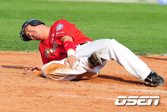 2011 롯데카드 프로야구 플레이오프 1차전 SK 4회초 1사 만루 박진만의 희생플라이때 홈을 파고들던 안치용이 부상을 당해 괴로워 하고 있다. 16일 부산사직구장에서 롯데 자이언츠와 SK 와이번스의 플레이오프 1차전 경기가 벌어졌다. 롯데는 예상대로 가장 컨디션이 좋은 장원준을 그대로 PO 1차전 선발로 내세웠고, 준플레이오프를 4차전으로 끝내면서 전력을 아낀 SK는 김광현을 1차전 선발 마운드에 올렸다. 롯데는 양승호 감독이 시리즈를 3연승으로 끝내겠다는 자신감을 나타냈고, SK는 준PO에서 먼저 1승을 내주고 3연승으로 리버스 스윕을 이끈 상승세를 바탕으로 치열한 경기가 예상된다. /spjj@osen.co.kr