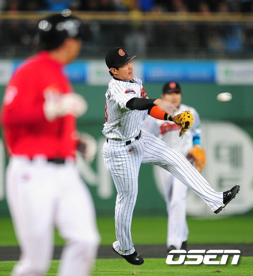 2011 롯데카드 프로야구 플레이오프 2차전 7회초 2사 2,3루 SK 정상호의 빗맞은 타구를 롯데 3루수 황재균이 맨손으로 잡아 송구 아웃, 위기를 탈출하고 있다. 17일 부산 사직구장에서 벌어진 플레이오프 2차전서 롯데는 양승호 감독이 예고한대로 송승준을 SK 이만수 감독은 고든을 각각 선발로 내세웠다. 송승준은 유독 SK에 시즌 내내 약세를 보여왔지만 양승호 감독은 선발로 밀어부치는 뚝심을 보여 결과가 어떻게 나올지 주목된다. 한편 1차전은 SK가 연장 10회 접전 끝에 롯데에 7-6의 기분좋은 역전승을 거두며 기선제압에 성공했다. 과연 2차전에서 송승준이 감독의 믿음에 부응, 위기의 팀을 구해 지긋지긋한 가을 악몽을 떨쳐낼지 아니면 SK 고든이 준플레이오프 상승세를 이어가며 2연승을 이끌지 관심이 집중된다. /spjj@osen.co.kr