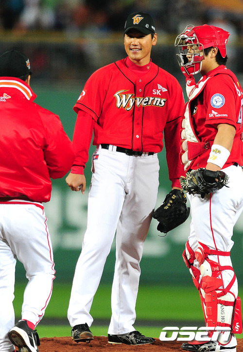 2011 롯데카드 프로야구 플레이오프 2차전 7회말 1사 1,2루 이영욱이 김주찬에게 안타를 맞고 교체 되고 있다. 17일 부산 사직구장에서 벌어진 플레이오프 2차전서 롯데는 양승호 감독이 예고한대로 송승준을 SK 이만수 감독은 고든을 각각 선발로 내세웠다. 송승준은 유독 SK에 시즌 내내 약세를 보여왔지만 양승호 감독은 선발로 밀어부치는 뚝심을 보여 결과가 어떻게 나올지 주목된다. 한편 1차전은 SK가 연장 10회 접전 끝에 롯데에 7-6의 기분좋은 역전승을 거두며 기선제압에 성공했다. 과연 2차전에서 송승준이 감독의 믿음에 부응, 위기의 팀을 구해 지긋지긋한 가을 악몽을 떨쳐낼지 아니면 SK 고든이 준플레이오프 상승세를 이어가며 2연승을 이끌지 관심이 집중된다. /spjj@osen.co.kr