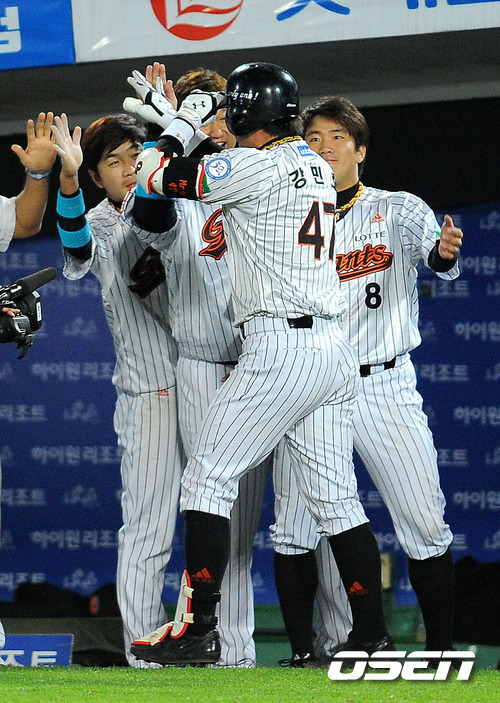 2011 롯데카드 프로야구 플레이오프 2차전 8회말 2사 롯데 강민호가 좌월 솔로홈런을 치고 덕아웃에서 동료들의 축하를 받고 있다. 17일 부산 사직구장에서 벌어진 플레이오프 2차전서 롯데는 양승호 감독이 예고한대로 송승준을 SK 이만수 감독은 고든을 각각 선발로 내세웠다. 송승준은 유독 SK에 시즌 내내 약세를 보여왔지만 양승호 감독은 선발로 밀어부치는 뚝심을 보여 결과가 어떻게 나올지 주목된다. 한편 1차전은 SK가 연장 10회 접전 끝에 롯데에 7-6의 기분좋은 역전승을 거두며 기선제압에 성공했다. 과연 2차전에서 송승준이 감독의 믿음에 부응, 위기의 팀을 구해 지긋지긋한 가을 악몽을 떨쳐낼지 아니면 SK 고든이 준플레이오프 상승세를 이어가며 2연승을 이끌지 관심이 집중된다. / sunday@osen.co.kr
