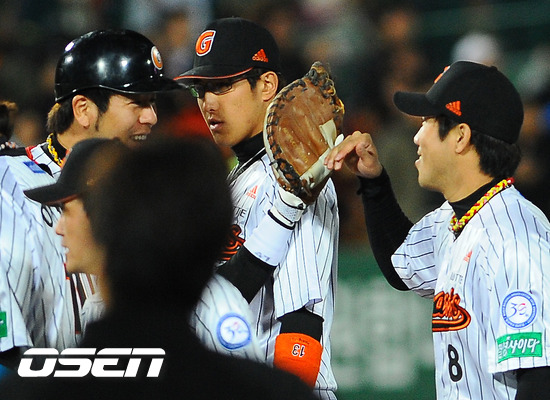 17일 오후 부산 사직구장에서 2011 롯데카드 프로야구 플레이오프 2차전 롯데 자이언츠와 SK 와이번스의 경기가 열렸다 롯데 자이언츠가 지긋지긋한 포스트시즌 홈 12연패의 늪에서 탈출하며 부산 홈 팬들에게 기쁨을 선사했다. 무려 4378일 만의 홈경기 승리다. 롯데는 17일 사직구장에서 열린 '2011 롯데카드 프로야구' SK 와이번스와 PO 2차전에서 선발 송승준의 1실점 호투와 전준우의 투런포 덕분에 4-1로 승리를 거뒀다. 덕분에 롯데는 지난 1999년부터 이어진 포스트시즌 홈 연패에서 벗어났다. 경기 종료 후 롯데 선수들이 승리의 기쁨을 나누고 있다./soul1014@osen.co.kr