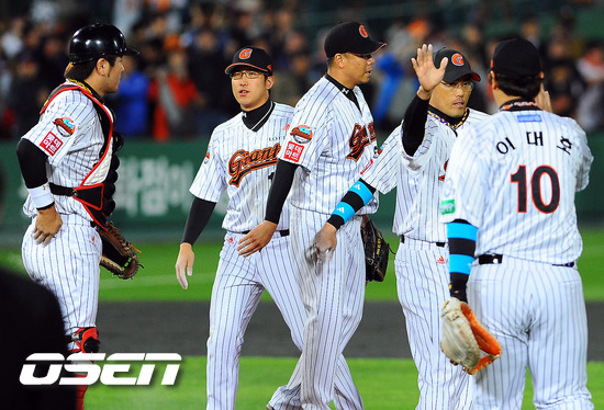 17일 오후 부산 사직구장에서 2011 롯데카드 프로야구 플레이오프 2차전 롯데 자이언츠와 SK 와이번스의 경기가 열렸다 롯데 자이언츠가 지긋지긋한 포스트시즌 홈 12연패의 늪에서 탈출하며 부산 홈 팬들에게 기쁨을 선사했다. 무려 4378일 만의 홈경기 승리다. 롯데는 17일 사직구장에서 열린 '2011 롯데카드 프로야구' SK 와이번스와 PO 2차전에서 선발 송승준의 1실점 호투와 전준우의 투런포 덕분에 4-1로 승리를 거뒀다. 덕분에 롯데는 지난 1999년부터 이어진 포스트시즌 홈 연패에서 벗어났다. 경기 종료 후 롯데 선수들이 승리의 기쁨을 나누고 있다./soul1014@osen.co.kr