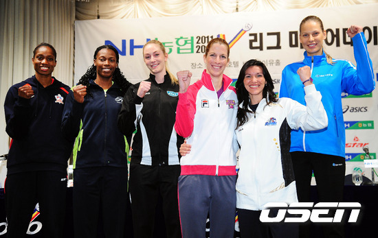 [OSEN= 백승철 인턴기자] 18일 오전 서울 청담동 리베라 호텔에서 열린 'NH농협 2011-2012 V리그' 여자부 미디어데이에 참석한 6개 구단 외국인 선수들이 기념촬영을 하고 있다. 정규리그 순위 승점제 도입과 외국인선수 3세트 출전제한 폐지, 포스트시즌 경기 수 변경 등이 반영된 'NH농협 2011-2012 V리그' 여자부 경기는 오는 22일 첫 경기를 시작으로 6개월여간의 대장정에 들어간다. / baik@osen.co.kr