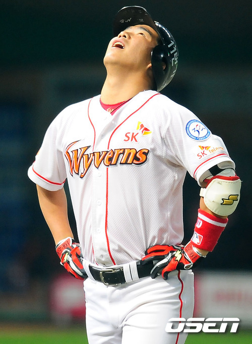 2011 롯데카드 프로야구 플레이오프 3차전 SK 와이번스와 롯데 자이언츠의 경기에서 7회말 1사 주자 1,3루 SK 정근우가 자신의 타구가 3루수 라인드라이브 아웃 후 3루수 터치아웃 되자 아쉬워하고 있다. 19일 문학구장에서 벌어진 3차전서 SK는 송은범을 롯데는 사도스키를 내세워 한국시리즈로 가는 중요한 일전을 벌인다. 양팀은 1차전서는 연장 접전 끝에 정상호의 홈런을 앞세운 SK가 2차전서는 송승준의 역투와 전준우의 투런 홈런으로 롯데가 승리를 거두어 사이좋게 1승씩을 나누어 가졌다. SK 이만수 감독은 플레이오프 3차전을 앞두고 타순 조정을 통한 필승의지를 다졌다.이 감독은"박정권이 4번, 안치용이 5번, 그리고 최동수가 지명타자로 6번으로 배치 필승의 의지를 다졌다. 롯데 양승호 감독은 "선수들이 많이 성숙해졌다. 1차전서 그렇게 지고 위축될 줄 알았는데 2차전을 승리로 이끌었다"며 선수들을 칭찬했다. / rumi@osen.co.kr