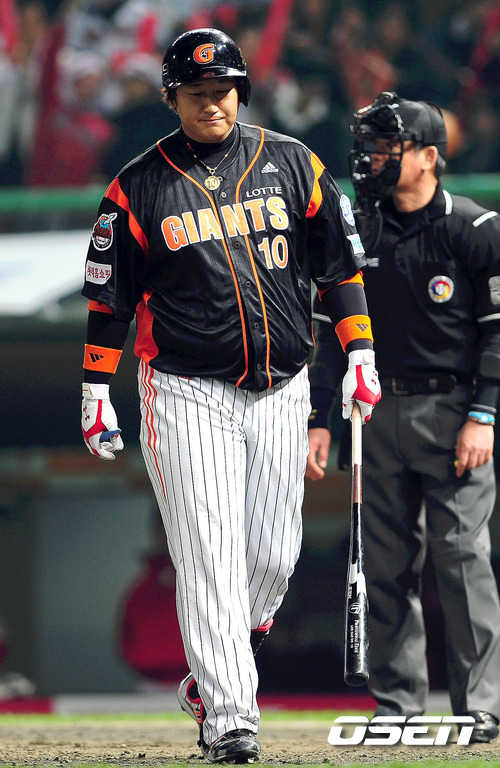 2011 롯데카드 프로야구 플레이오프 SK 와이번스와 롯데 자이언츠의 경기 8회초 무사 1루 이대호가 룩킹 삼진으로 물러나고 있다. 19일 문학구장에서 벌어진 3차전서 SK는 송은범을 롯데는 사도스키를 내새워 한국시리즈로 가는 중요한 일전을 벌인다. 양팀은 1차전서는 연장 접전 끝에 정상호의 홈런을 앞세운 SK가 2차전서는 송승준의 역투와 전준우의 투런 홈런으로 롯데가 승리를 거두어 사이좋게 1승씩을 나누어 가졌다. SK 이만수 감독은 플레이오프 3차전을 앞두고 타순 조정을 통한 필승의지를 다졌다.이 감독은"박정권이 4번, 안치용이 5번, 그리고 최동수가 지명타자로 6번으로 배치 필승의 의지를 다졌다. 롯데 양승호 감독은 '선수들이 많이 성숙해졌다. 1차전서 그렇게 지고 위축될 줄 알았는데 2차전을 승리로 이끌었다'며 선수들을 칭찬 했다. /spjj@osen.co.kr