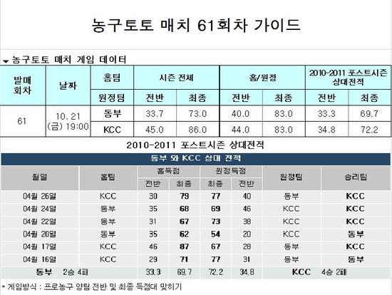 [농구토토] 국민체육진흥공단(www.kspo.or.kr)이 발행하는 체육진흥투표권 수탁사업자인 스포츠토토 공식 온라인 발매사이트인 베트맨(www.betman.co.kr)이 21일 오후 7시 원주치악체육관에서 벌어지는 동부-KCC전 대상 농구토토 매치 61회차 투표율을 중간 집계한 결과, 전체 참가자의 43.48%는 원정팀 KCC가 동부를 상대로 승리를 거둘 것으로 예상했다. 10점 이내 박빙 승부를 펼칠 것으로 예상한 참가자는 32.24%로 집계됐고, 나머지 24.29%는 홈팀 동부의 승리를 예상했다. 전반전에서는 KCC 우세(54.64%)예상이 1순위로 집계됐고, 5점 이내 박빙(28.08%)과 동부 우세(17.28%) 예상이 뒤를 이었다. 전반득점대에서는 35-35점대 접전(12.82%) 예상이 최다로 집계됐고, 최종득점대에서도 80-80점대 접전(16.07%) 예상이 가장 높게 나타났다. 스포츠토토 관계자는 "수비력이 돋보이는 동부와 디펜딩 챔피언 KCC가 지난 시즌 챔피언결정전 이후 처음 만난다"며 "동부가 올 시즌 3연승을 거두며 단독 선두로 올라서긴 했지만, 국내 최장신 센터 하승진과 무서운 신인 김태홍이 버티고 있는 KCC의 전력을 만만히 볼 수 있는 수준은 아니다"고 전했다. 농구토토 매치 61회차는 경기시작 10분전인 21일 오후 6시 50분 발매가 마감된다.