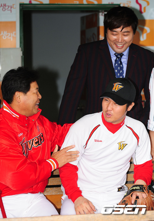 20일 오후 문학구장에서 '2011 롯데카드 프로야구 플레이오프' 4차전 SK 와이번스와 롯데 자이언츠의 경기가 열릴 예정인 가운데 양팀이 훈련시간을 가졌다. 덕아웃에서 SK 최정이 SK 이만수 감독 대행과 양준혁 해설에게 칭찬을 받자 환하게 미소짓고 있다. 이번 4차전 선발로 SK는 윤희상(26)를 롯데는 크리스 부첵(33)을 내세운다. 플레이오프가 마감될 수 있는 4차전이라는 점에서 양 팀 모두 피할 수 없는 한판이다. 양팀은 1차전서는 연장 접전 끝에 정상호의 홈런을 앞세운 SK가 2차전서는 송승준의 역투와 전준우의 투런 홈런으로 롯데가 승리를 거두어 사이좋게 1승씩을 나누어 가졌다. 그러나 SK는 3차전서 선발 송은범의 무실점 호투와 최동수의 결승타, 김강민의 2타점 쐐기타를 앞세워 승리를 거둬 한국시리즈에 1승만을 남겨둔 상태. 반면 탈락 위기에 놓인 롯데는 필승의지를 다지고 있다. / rumi@osen.co.kr
