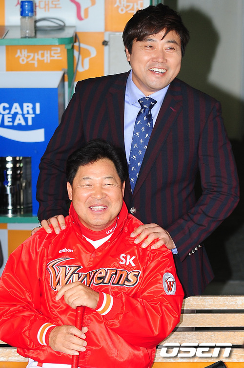 20일 오후 문학구장에서 '2011 롯데카드 프로야구 플레이오프' 4차전 SK 와이번스와 롯데 자이언츠의 경기가 열릴 예정인 가운데 양팀이 훈련시간을 가졌다. 덕아웃에서 양준혁 해설자가 SK 이만수 감독 대행의 어깨를 주무르며 말을 걸고 있다. 이번 4차전 선발로 SK는 윤희상(26)를 롯데는 크리스 부첵(33)을 내세운다. 플레이오프가 마감될 수 있는 4차전이라는 점에서 양 팀 모두 피할 수 없는 한판이다. 양팀은 1차전서는 연장 접전 끝에 정상호의 홈런을 앞세운 SK가 2차전서는 송승준의 역투와 전준우의 투런 홈런으로 롯데가 승리를 거두어 사이좋게 1승씩을 나누어 가졌다. 그러나 SK는 3차전서 선발 송은범의 무실점 호투와 최동수의 결승타, 김강민의 2타점 쐐기타를 앞세워 승리를 거둬 한국시리즈에 1승만을 남겨둔 상태. 반면 탈락 위기에 놓인 롯데는 필승의지를 다지고 있다. / rumi@osen.co.kr