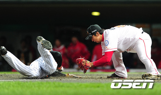 '2011 롯데카드 프로야구 플레이오프' 4차전 SK 와이번스와 롯데 자이언츠의 경기 5회초 1사 2루 김주찬의 중전 안타때 김주찬이 2루로 달려 송구가 2루로 가자 조성환이 홈을 파고들었지만 아웃 되고 있다. 20일 인천 문학구장에서 SK 와이번스와 롯데 자이언츠의 플레이오프 4차전 경기가 벌어졌다. 4차전 선발로 SK는 윤희상(26)을 롯데는 크리스 부첵(33)을 내세웠다. 플레이오프가 마감될 수 있는 4차전이라는 점에서 양 팀 모두 피할 수 없는 한판이다. 양팀은 1차전은 연장 접전 끝에 정상호의 홈런을 앞세운 SK가 ,2차전은 송승준의 역투와 전준우의 투런 홈런으로 롯데가 승리를, 3차전은 SK가 송은범의 호투를 바탕으로 승리를 거두어 시리즈 성적 2-1로 롯데를 벼랑 끝으로 밀어 넣었다. 한국시리즈 진출에 단 1승만을 남겨놓은 SK가 이대로 분위기를 이어갈지. 반면 탈락 위기에 놓인 롯데가 국면 전환을 할지 관심거리다. /spjj@osen.co.kr