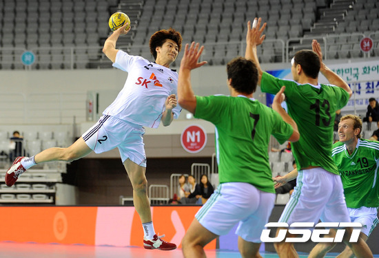 24일 오후 서울 방이동 올림픽공원 SK 올림픽핸드볼경기장에서 열린 한국과 카자흐스탄의 '2012 런던올림픽 핸드볼 아시아 남자예선' 경기, 전반 한국 정의경이 카자흐스탄의 수비를 뚫고 슛을 시도하고 있다.