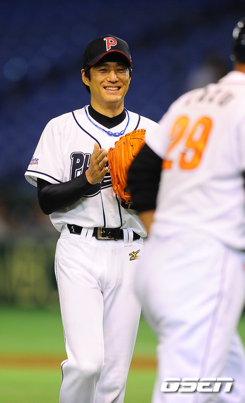 24일 오후 일본 도쿄돔에서 열린 '제2회 한일드림게임' 경기 8회말플레이보이즈 지진희 마무리 투수가 삼자범퇴 후 미소 지으며 더그아웃으로 들어가고 있다.