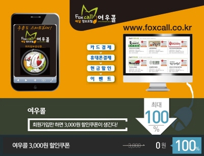 '여우콜(http://foxcall.co.kr)' 서비스는 전국 어디서나 배달 음식 혜택을 받을 수 있으며, 회원가입을 하지 않아도 할인 서비스를 받을 수 있다. 또한, 현금이 없을 때 카드 결제는 물론 휴대전화 결제도 가능하여 혼자 자취 생활을 하는 소비자들에게 특히 인기가 좋다.