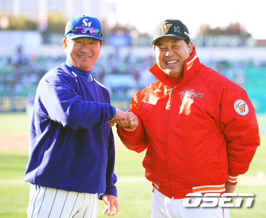 경기에 앞서 양팀 감독이 사진기자의 요청에 포즈를 취학고 있다.