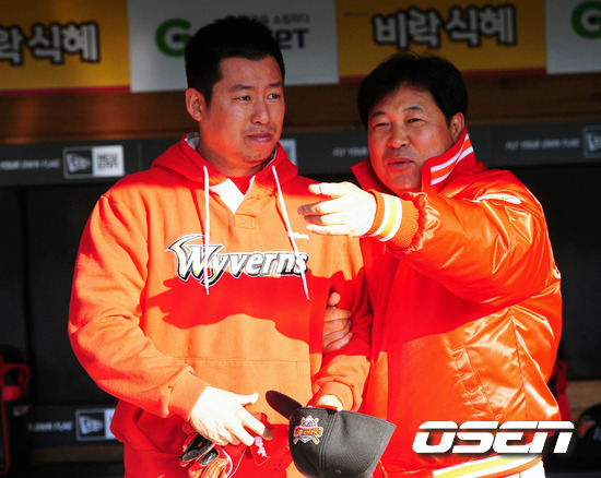 경기에 앞서 이만수 감독대행과 안치용이 이야기를 나누고 있다.