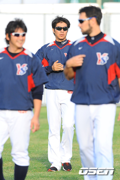 25일 오후 일본 도쿄 진구구장서 열리는 센트럴리그 야쿠르트 스왈로스와 히로시마 토요카프의 경기전 야쿠르트 임창용이 스트레칭을 하고 있다.