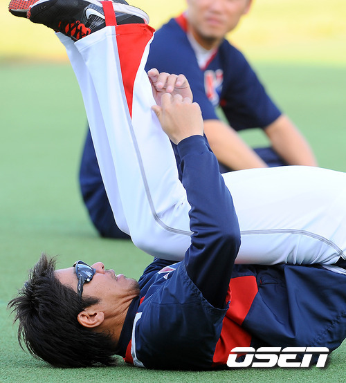 25일 오후 일본 도쿄 진구구장서 열리는 센트럴리그 야쿠르트 스왈로스와 히로시마 토요카프의 경기전 야쿠르트 임창용이 스트레칭을 하고 있다.