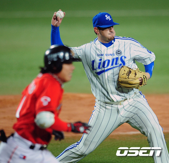 1회초 무사 1루 박재상의 보내기 번트때 삼성 선발 매티스가 아웃처리 시키고 있다.