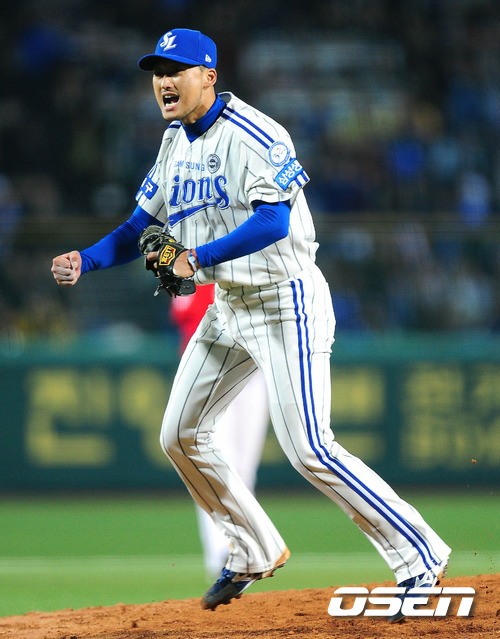 '2011 롯데카드 프로야구 한국시리즈' 2차전 삼성 라이온즈와 SK 와이번스 6회초 1사 2,3루서 마운드에 오른 권오준이 SK 안치용 김강민을 연이어 삼진으로 처리하고 환호하고 있다.