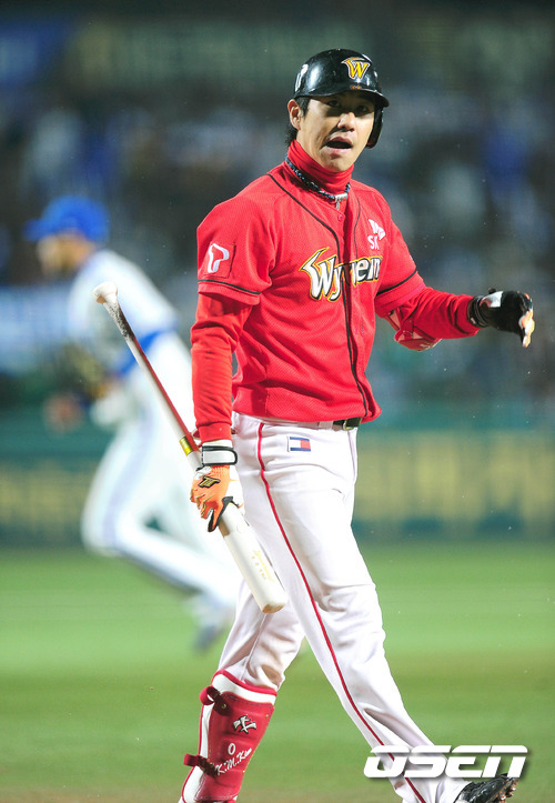 '2011 롯데카드 프로야구 한국시리즈' 2차전 삼성 라이온즈와 SK 와이번스 6회초 1사 2,3루 찬스서 마운드에 오른 권오준에게 삼진을 당한 SK 김강민이 아쉬운 표정으로 덕아웃으로 가고 있다.