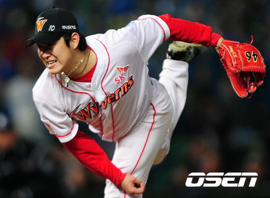 '2011 롯데카드 프로야구 한국시리즈' 3차전 SK 와이번스와 삼성 라이온즈의 경기, 4회말 2사 2루에서 SK 선발투수 송은범이 역투하고 있다.