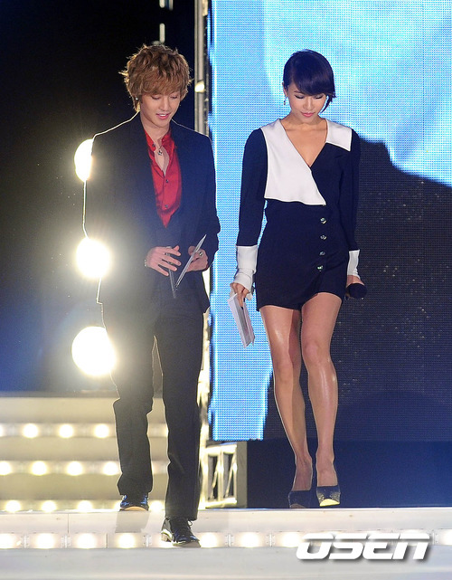 가수 김현중과 배우 하지원이 무대로 입장하고 있다.