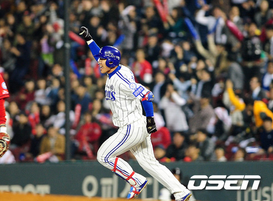 '2011 롯데카드 프로야구 한국시리즈' 5차전 삼성 라이온즈와 SK 와이번스의 경기 4회말 2사 강봉규가 좌측 펜스를 넘어가는 솔로 홈런을 치고 환호 하고 있다.