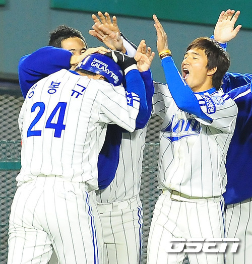 '2011 롯데카드 프로야구 한국시리즈' 5차전 삼성 라이온즈와 SK 와이번스의 경기에서 4회말 1사 주자 없는 상황에서 삼성 강봉규가 좌월 선취 솔로 홈런을 날린 후 덕아웃에서 동료들과 기쁨을 나누고 있다.