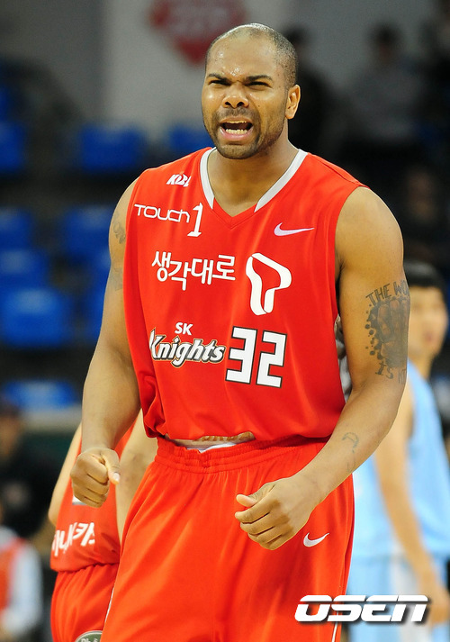 [OSEN=잠실학생체 ,백승철 인턴기자] 1일 오후 서울 잠실 학생체육관서 열린 '2011-2012 KB국민카드 프로농구' 서울 SK와 울산 모비스의 경기 4쿼터 경기 종료 직전 SK의 승리가 확실시 되자 존슨이 환호하고 있다.