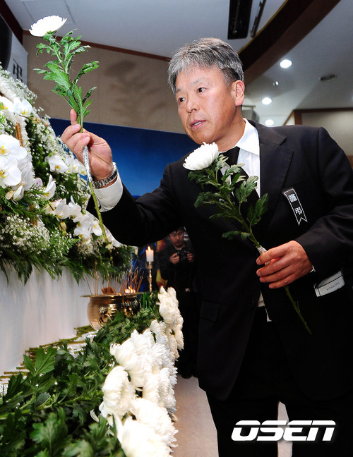 히말라야 안나푸르나에 '코리안 루트'를 개척하다 실종된 고 박영석 대장과 강기석, 신동민 대원에 대한 합동 영결식이 3일 오전 서울 종로구 연건동 서울대학교병원 생명연구원에서 엄수된 가운데 산악인 엄홍길 대장이 헌화를 하고 있다.