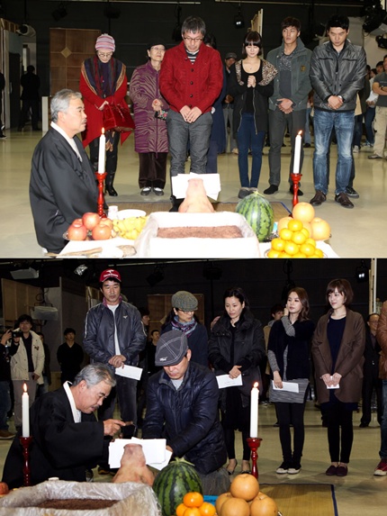 극중 춘복네(김갑수 분), 상엽네(홍요섭 분), 준태네(이한위 분) 가족별로 삼삼오오 모인 가운데 배우 대표로 술을 올린 김갑수와 이한위 외 다른 출연진들도 한 마음을 한 뜻으로 정성스레 절을 올리고 두 손 모아 기도를 하며 진지하게 고사에 임했다.