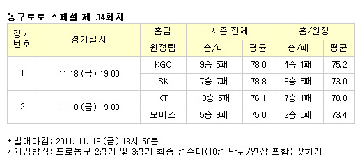 농구토토 스페셜 34회차 게임은 경기 시작 10분 전인 18일(금) 오후 6시 50분에 발매가 마감된다.