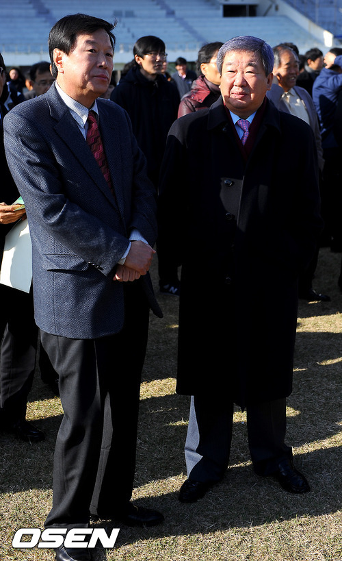 24일 오후 전남 광주시 임동 무등경기장 종합경기장에서 열린 광주 새 야구경기장 기공식에서 KBO 구본능 총재와 이상국 전 사무총장이 이야기를 나누고 있다.