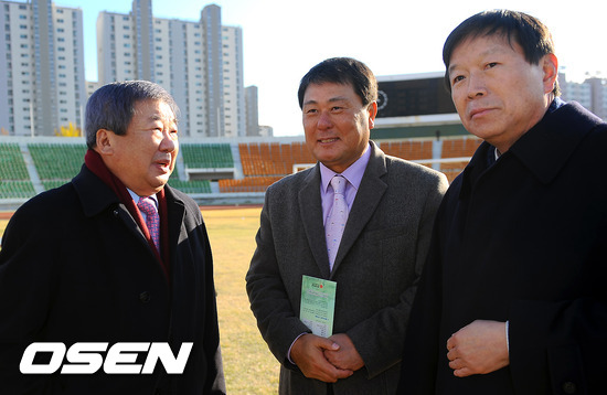 24일 오후 전남 광주시 임동 무등경기장 종합경기장에서 열린 광주 새 야구경기장 기공식에서 KBO 구본능 총재와 김성한 전 감독, 이상국 전 사무총장이 이야기를 나누고 있다.