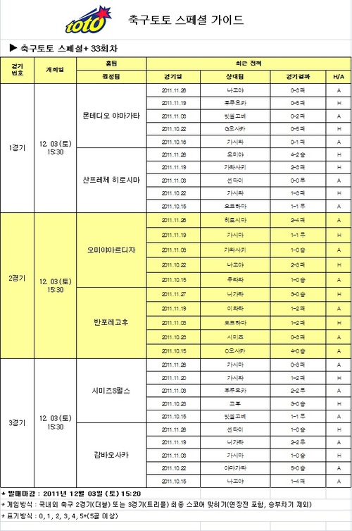 이번 축구토토 스페셜플러스 33회차는 3일 오후 3시 20분에 발매가 마감되며, 경기가 모두 종료된 후 결과가 발표된다.