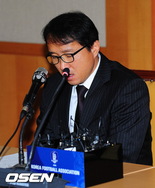 8일 오전 서울 종로구 축구회관에서 열린 조광래(57) 축구 국가대표팀 감독 전격 경질관련 기자회견에서 황보관 기술위원장이 한숨을 쉬고 있다.