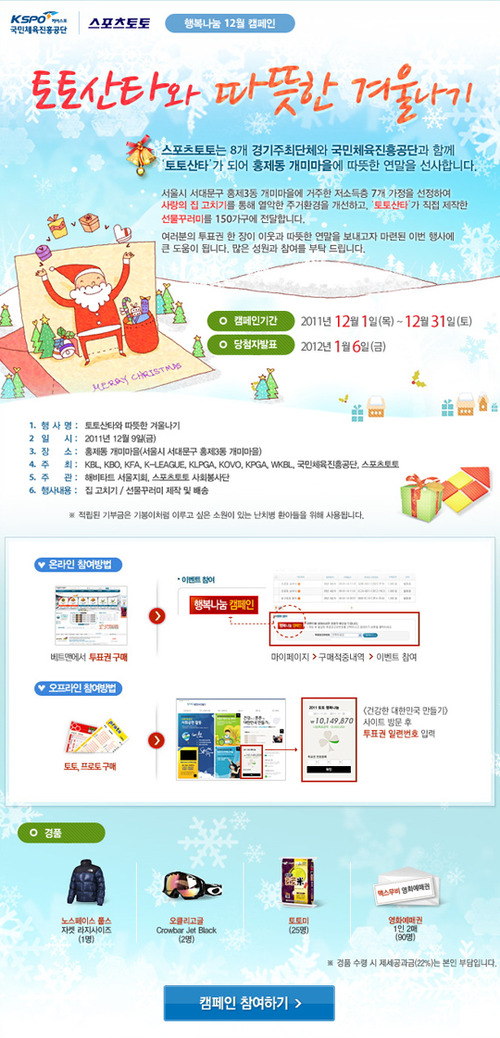 국민체육진흥공단(www.kspo.or.kr)이 발행하는 체육진흥투표권 수탁사업자인 스포츠토토(www.sportstoto.co.kr)는 31일까지 '행복나눔 12월 캠페인'을 실시한다.