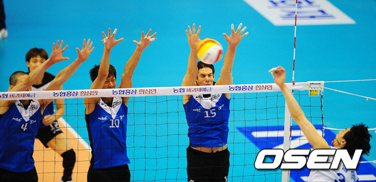 14일 오후 대전시 중구 충무체육관에서 열린 'NH농협 2011-2012 V리그' 삼성화재와 현대캐피탈의 경기에서 현대캐피탈 문성민이 윤봉우 수니아스가 삼성화재 박철우의 강타를 막기위해 블로킹을 시도하고 있다.