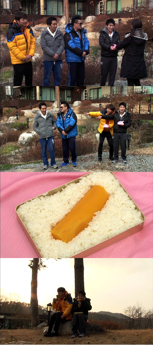 결국 유상무와 장동민은 꽝꽝 언 흰 쌀밥과 통단무지를 영하 10도의 강추위에 쏟아지는 눈을 맞으며 쪼그려 앉아 먹어야만 했다는 후문이다.