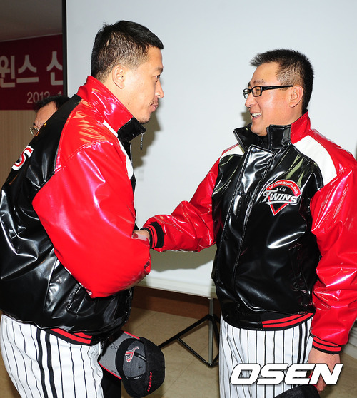 5일 오전 잠실구장에서 열린 LG 트윈스 시무식에서 LG 김기태 감독과 새 주장으로 뽑힌 이병규가 악수를 나누고 있다.