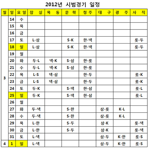 한국야구위원회(KBO)는 오는 3월 17일 개막되는 2012 프로야구 시범경기 일정을 발표했다.