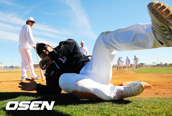 26일(이하 한국시간) 미국 애리조나주 피오리아 '피오리아 스포츠 콤플렉스'에서 진행된 두산 스프링캠프에서 두산 이토 수석코치가 직접 슬라이딩 시범을 보이고 있다.