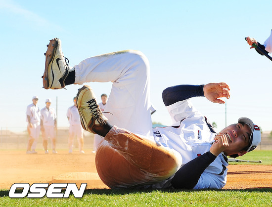 26일(이하 한국시간) 미국 애리조나주 피오리아 '피오리아 스포츠 콤플렉스'에서 진행된 두산 스프링캠프에서 두산 김현수가 슬라이딩 후 땅을 구르고 있다.